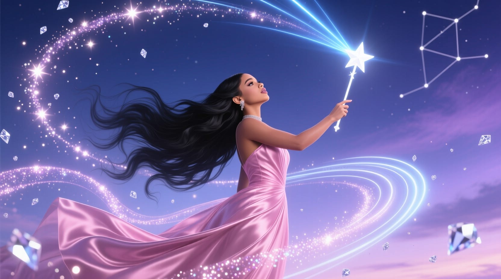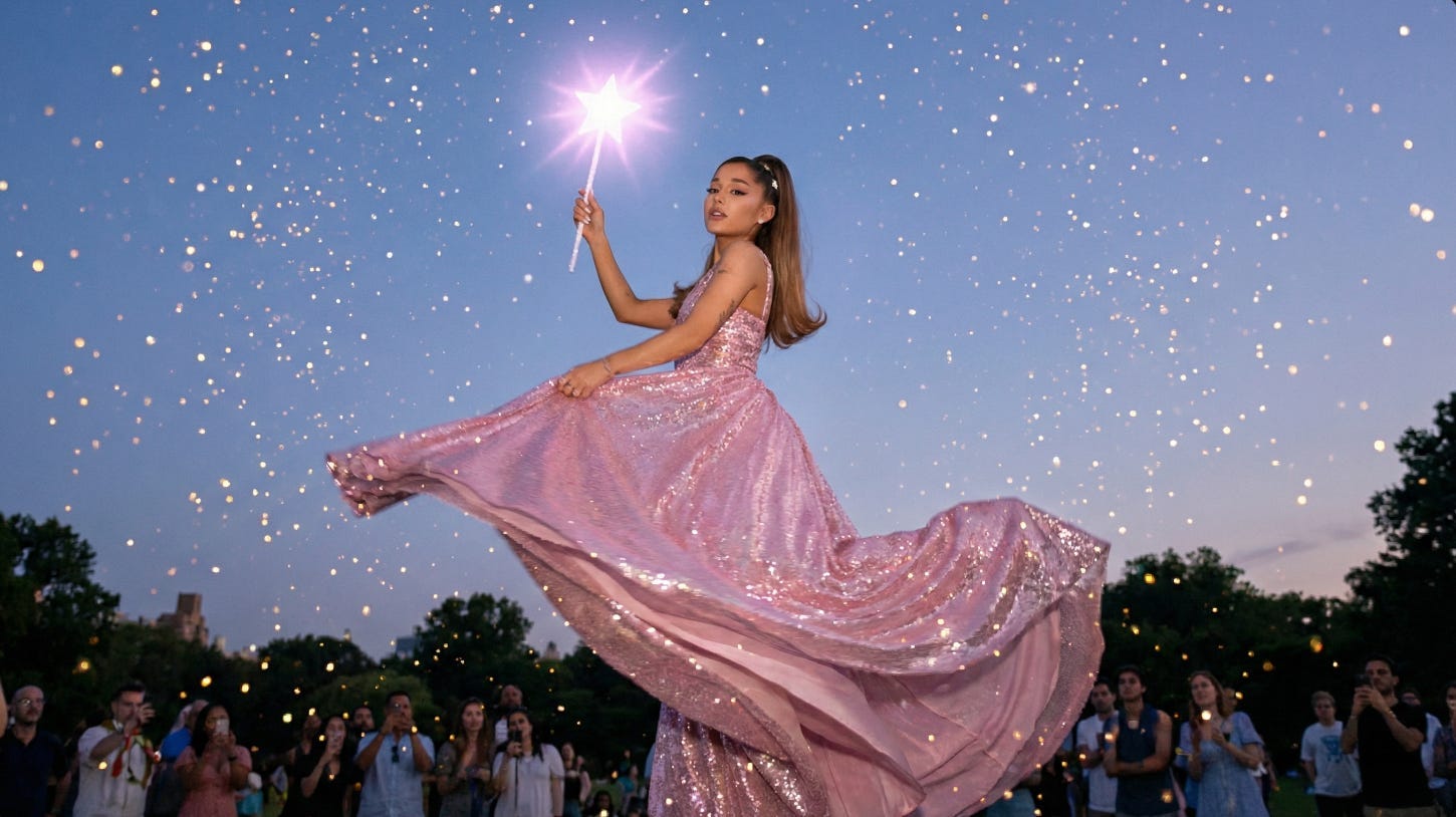 “A woman who looks like Ariana Grande in a pink dress swirling upwards to the sky with glitters around, hand holding a white star wand and the wand is flashing light.”