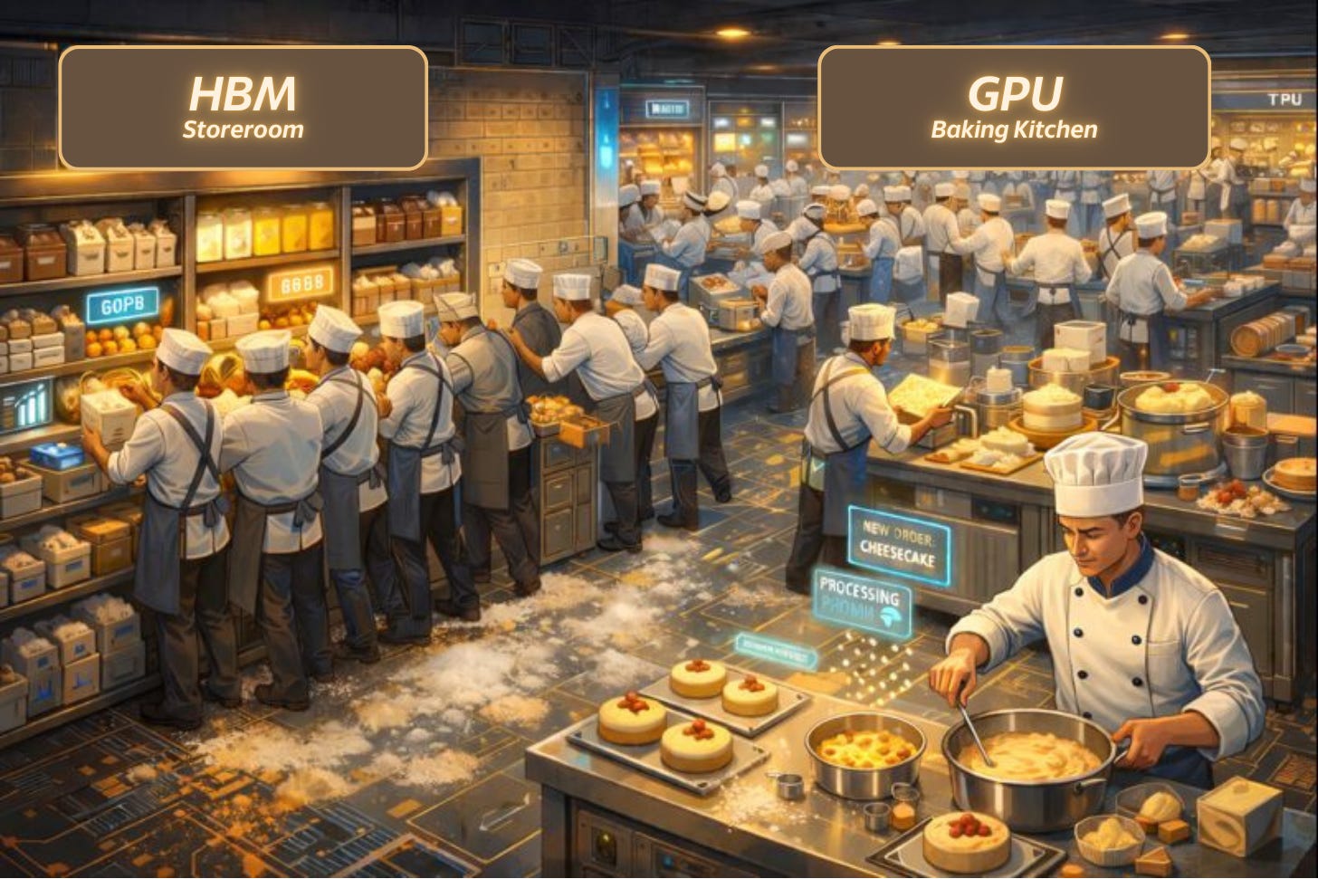 Picture AI running inference like chefs busy preparing cheesecakes for new orders. The bakery kitchen represents the GPU, while high-bandwidth memory (HBM) is the large storeroom next door where ingredients are stored and retrieved.