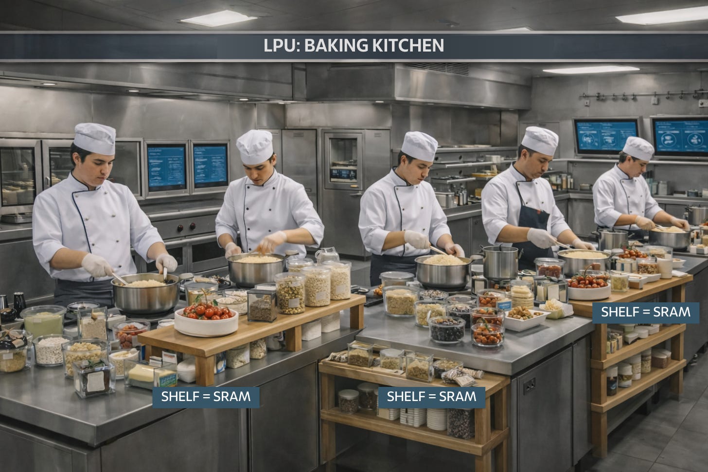 Instead of chefs constantly walking to a shared storeroom, each baking station has its own small shelf of ingredients. This shelf represents SRAM, much smaller than the main storeroom (HBM), but placed right where baking happens.
