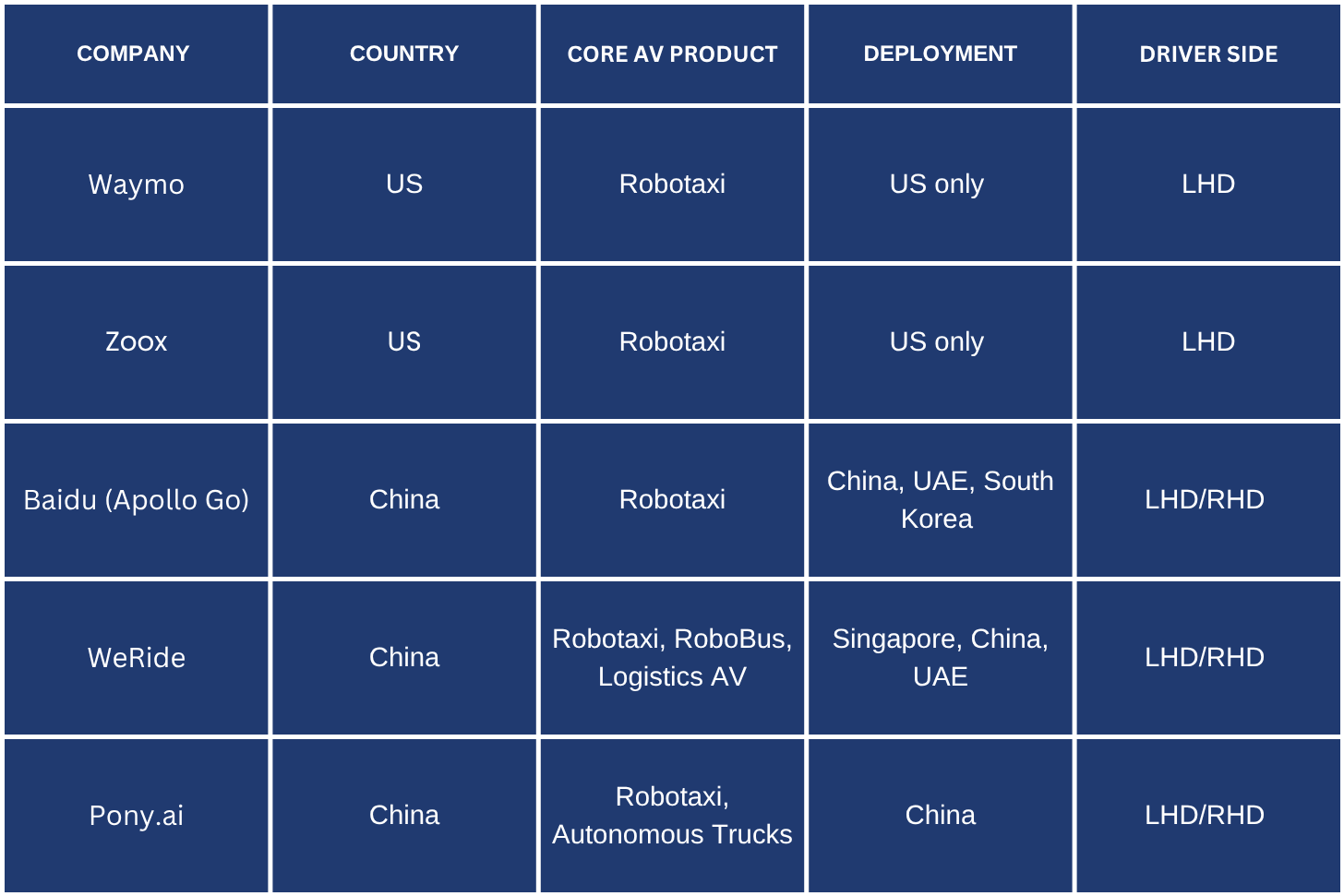 Adoption across markets, however, is not one-size-fits-all. Vehicles must align with local road systems, such as left- or right-hand drive (LHD/RHD), as well as local environmental conditions, such as weather and road quality, factors that shape where AVs can realistically operate.
